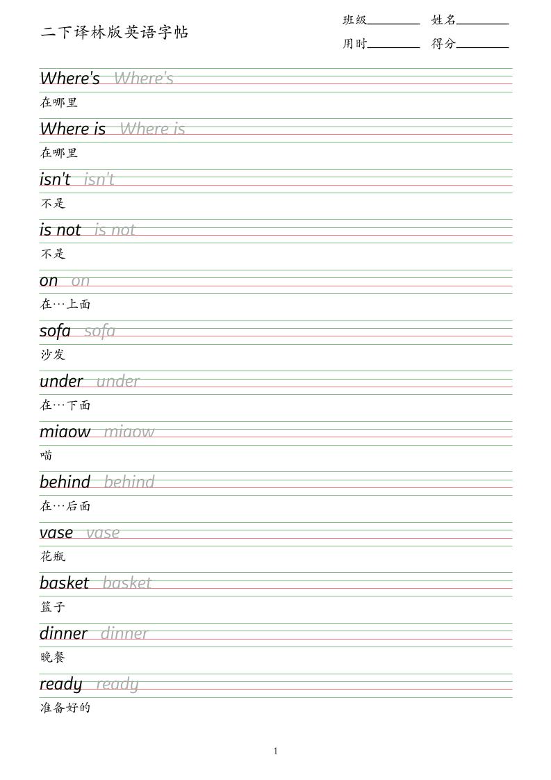二下译林版英语字帖