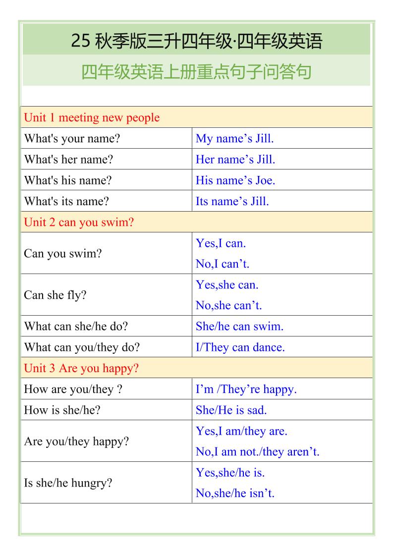 【2025秋新版】四年级英语上册各单元必须要掌握的重点句型