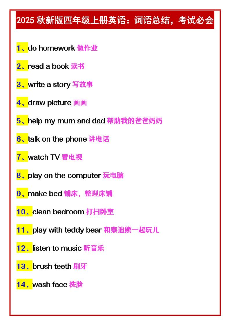 【2025秋新版】四年级上册英语:词语总结,考试必会