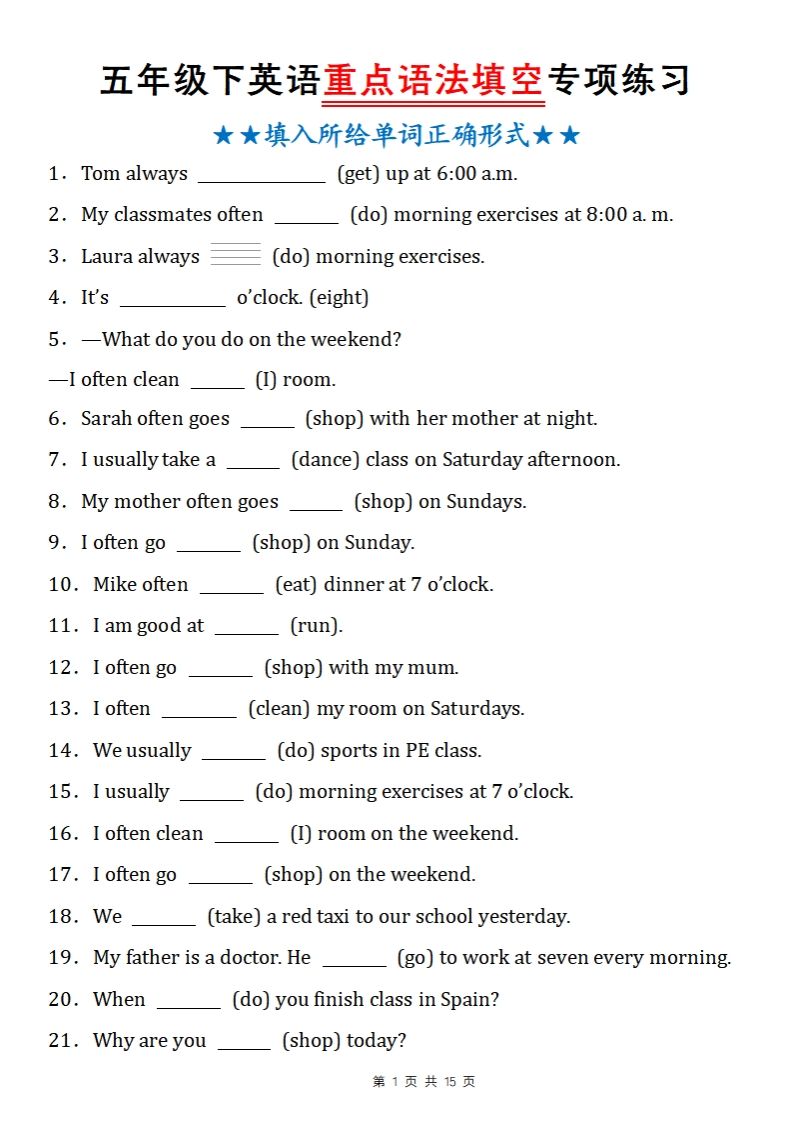 五下英语人教PEP各单元核心基础题专项练习(unit1)
