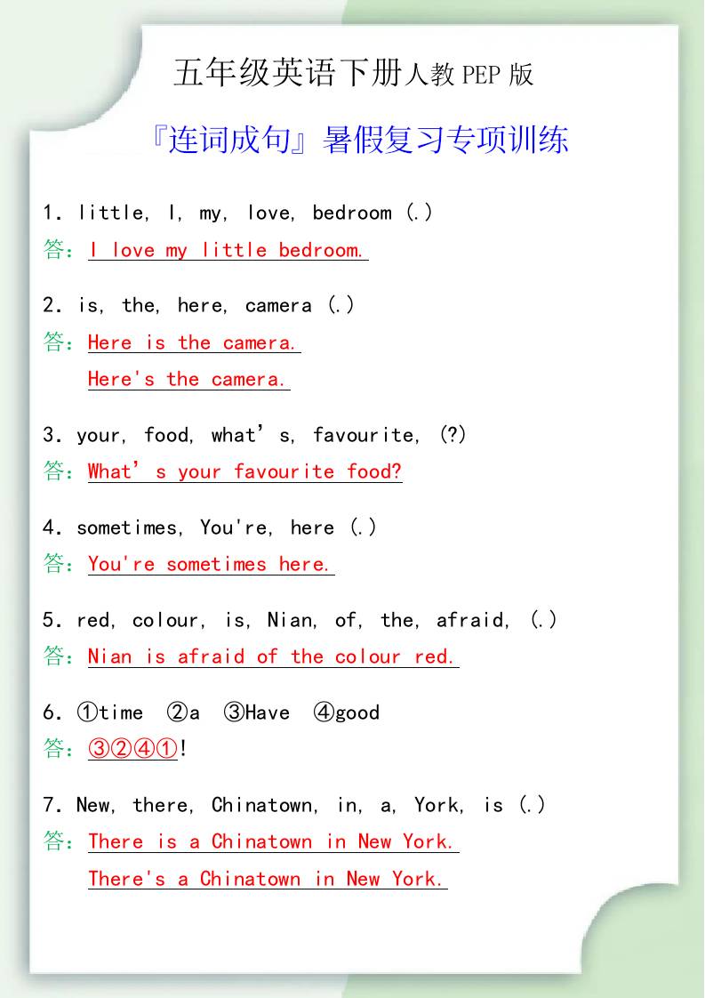 五年级英语下册『连词成句』暑假复习专项训练