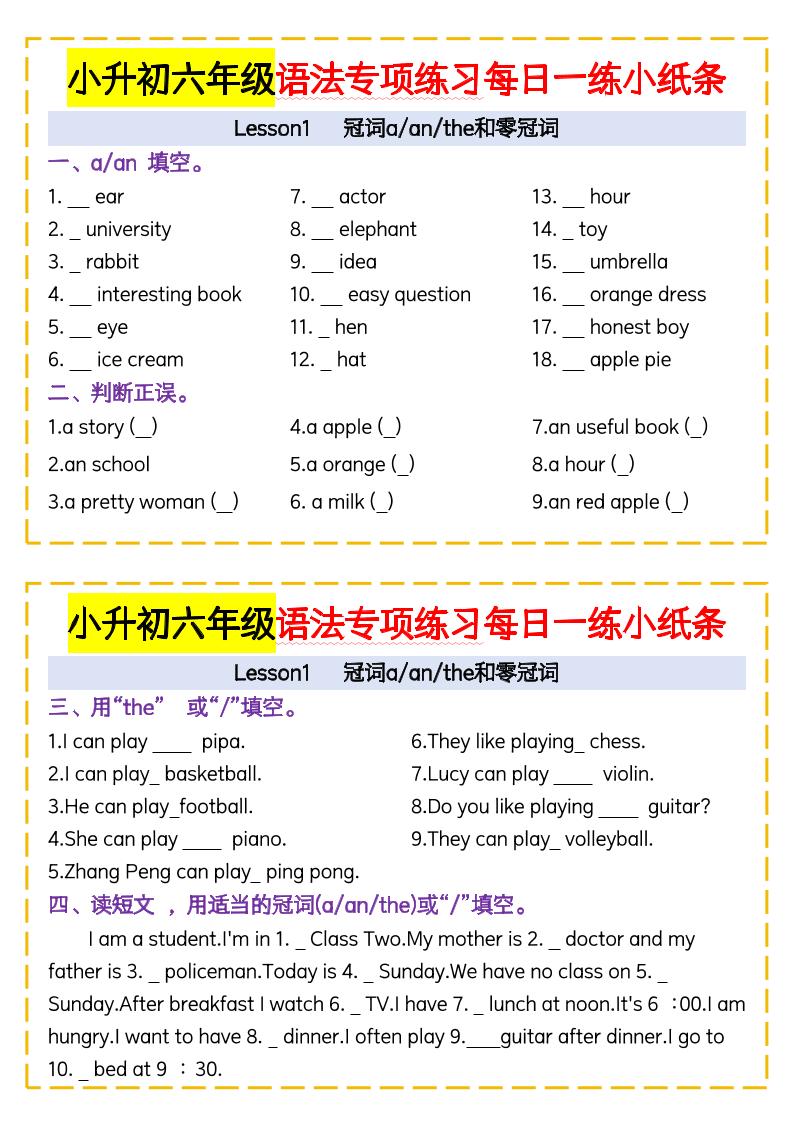 小升初语法专项练习每日一练小纸条