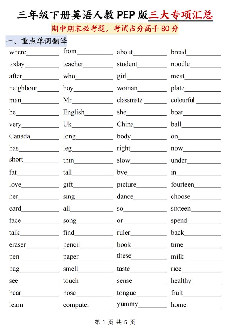 三下人教PEP版英语三大专项汇总10页
