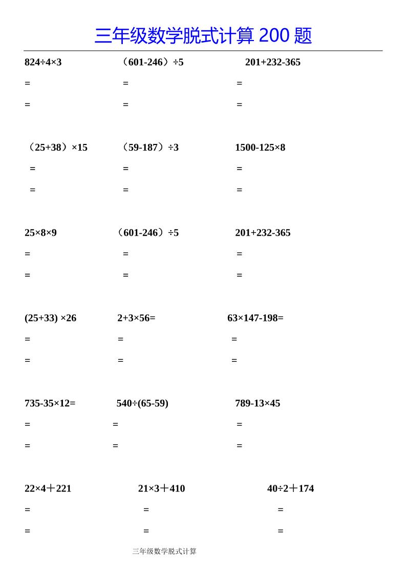 三下数学【脱式计算200题】