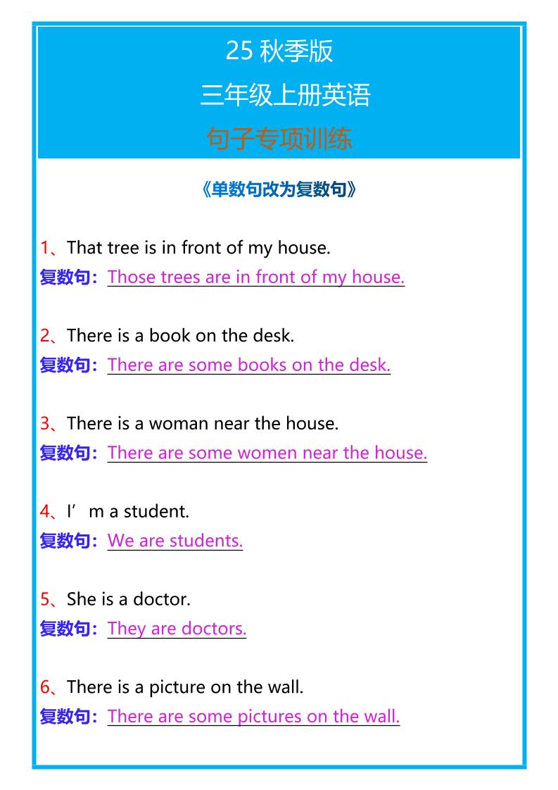 【2025秋新版】三年级上册英语句子专项训练