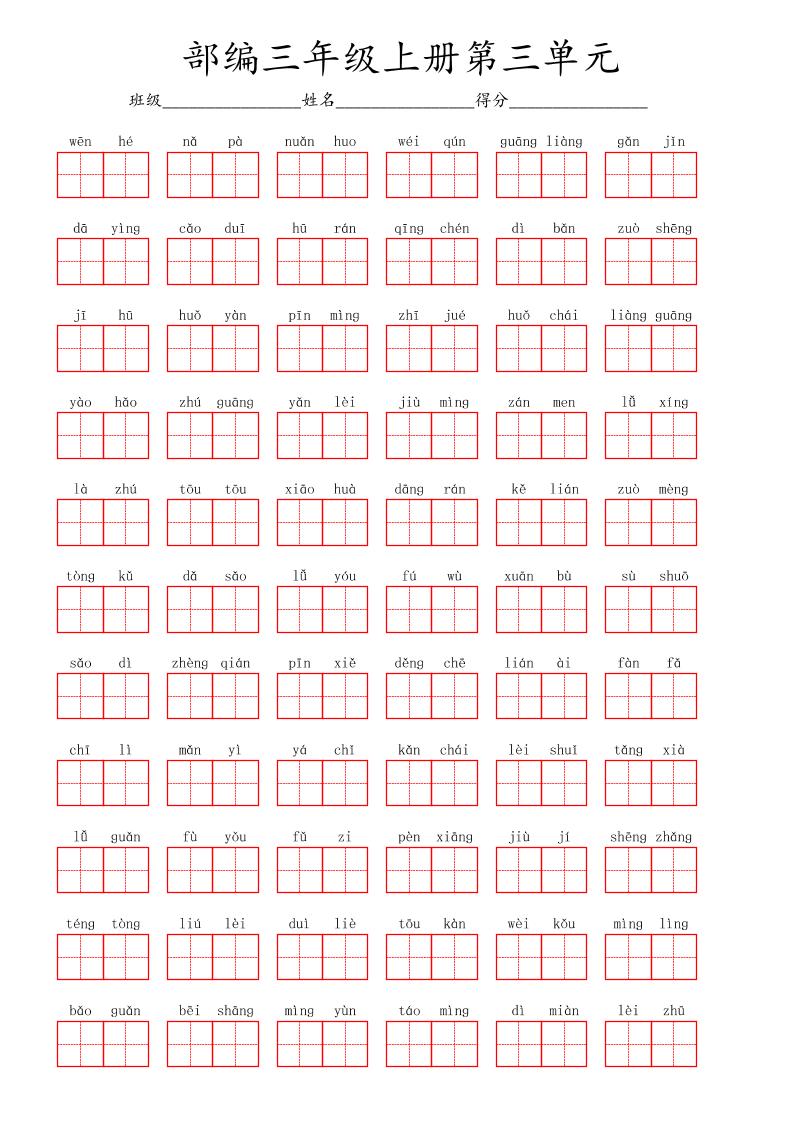 看拼音写词语三年级上册语文第三单元